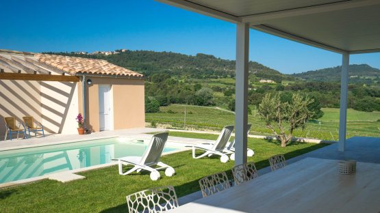 De gastenkamers hebben niet alleen een mooi zicht op deze berg, maar ook op de druivenvelden die ons omringen. De chambres d’hotes ligt op een dominante plek in het landschap, rustig gelegen zonder geïsoleerd te zijn, aan de rand van een klein hameau.